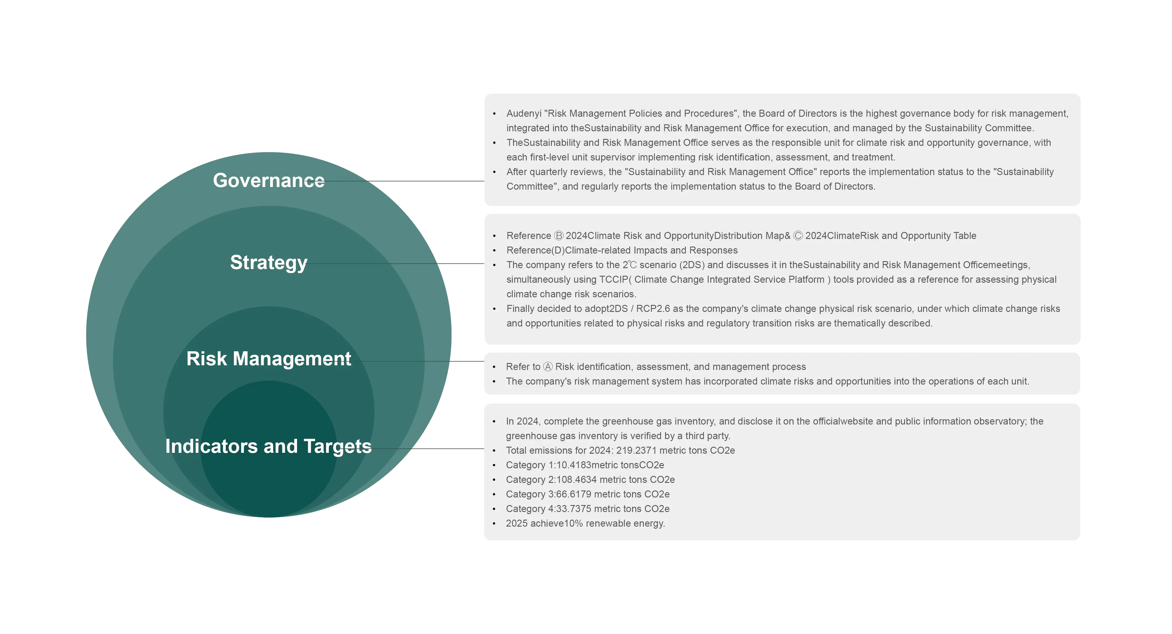 Auden has established an internal control system and internal audit system, and established a risk management policy to implement integrated risk management related to environmental, social, and governance aspects of sustainable operations. With the increasing importance of extreme weather caused by global warming and the impact of energy and climate change issues in recent years, Auden needs to fulfill its corporate sustainability responsibilities in order to achieve sustainable development in the industry. According to the framework of the Task Force on Climate-related Financial Disclosures (TCFD), Auden is divided into governance, strategy, risk management, indicators, and goals, etc., and the Office of Sustainable Development identifies climate-related risks and opportunities, formulates follow-up response strategies, and reports to the board of directors regularly every year, and the board of directors monitors the implementation results.
